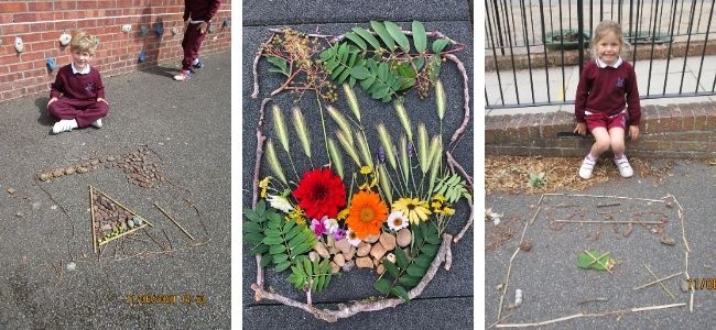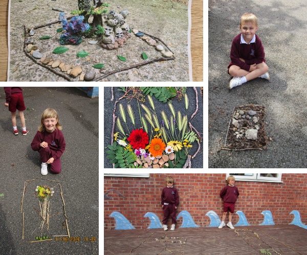 During outdoor learning this week, Year 1 used sticks to create a picture frame which they then filled with all sorts of natural materials to create a rustic picture or pattern.