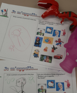 The children in our Monday Pre-Reception class are having lots of fun learning French. They are brilliant at saying hello and introducing themselves. They have loved wearing dress-up masks and playing hide and seek with cartoon characters to help reinforce their learning. They have also been learning the colours by doing mini bean bag treasure hunts! Monsieur Cochon and Monsieur Dinosaure have been very helpful too – can you spot them in the picture?