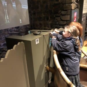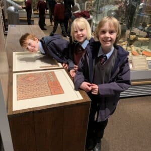We then went up to the roof and imagined being knights firing arrows down on enemies. We returned down another steep spiral staircase and the children had to guess what the garderobe room was used for! After our story tour we had some time to explore the museum. There were lots of interactive activities including; building an arch trying on helmets, chariot racing and visiting the prison to name just a few. After a brief lunch stop we were able to take part in various activities to learn more about life in the castle including sniffing the herbs and spices they grew to use as medicines to colouring an illuminated letter. One exciting part of the trip was the visit to the gift shop. Each pupil had their own £3 to spend and there was huge deliberation as to which souvenirs they could afford! The real life maths that they were learning was invaluable. After a final chance to view the exhibits and handle artefacts we left the castle and were very relieved to see the bus pull up as the rain was falling. Back in school the pupils had a chance to look at their purchases and all agreed they had learnt lots as well as having great fun.